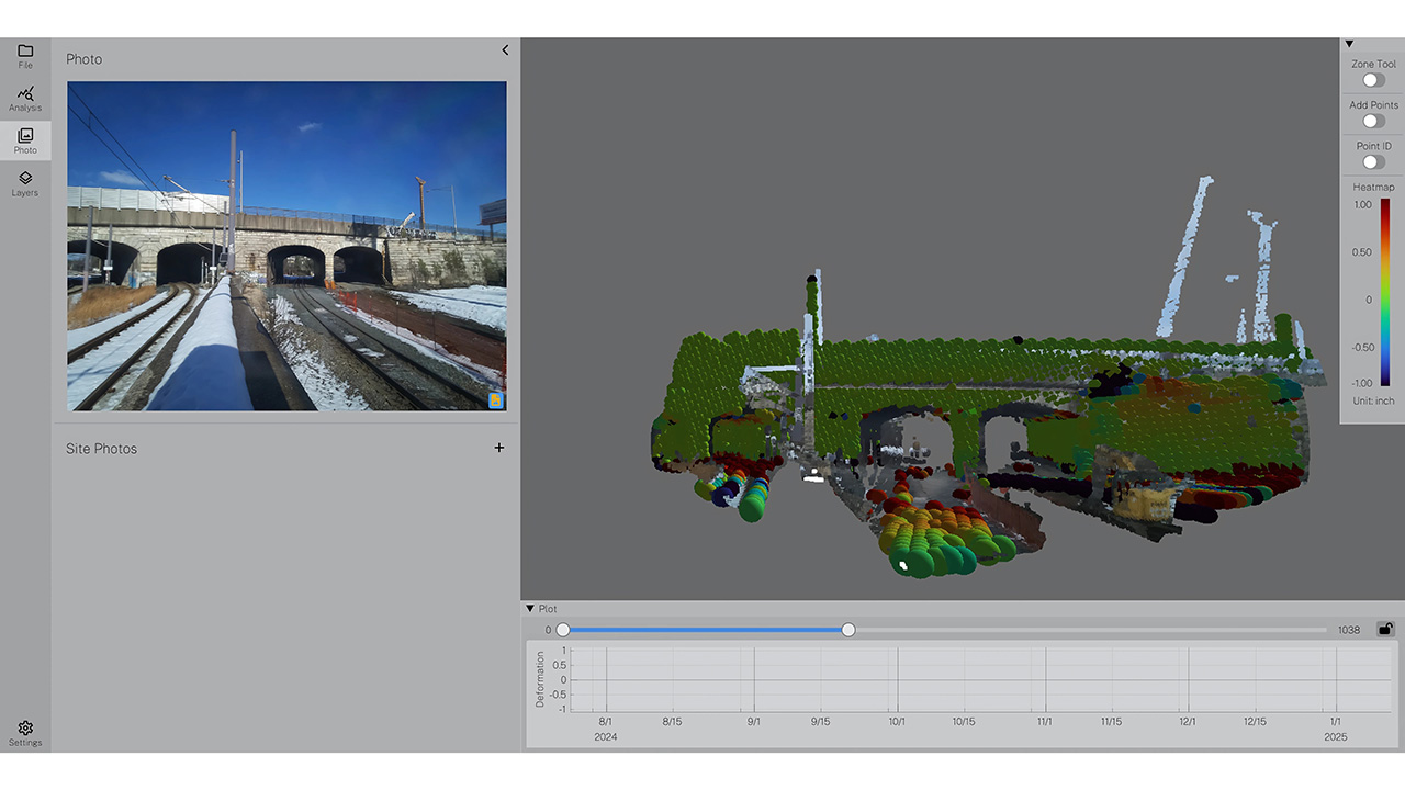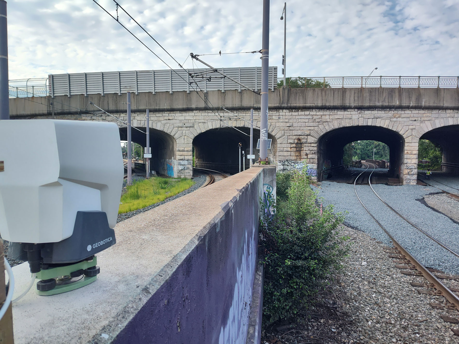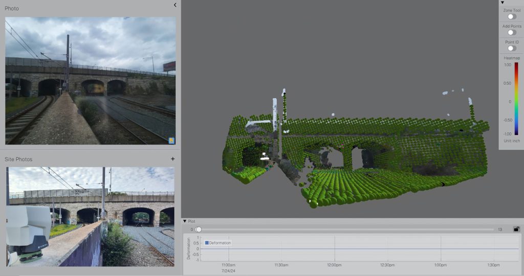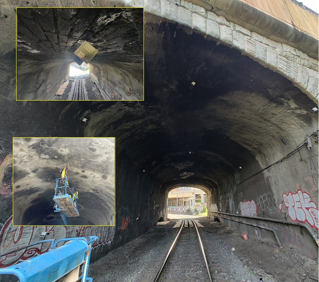The instrumentation program included convergence nodes and track monitoring devices within tunnel areas, as well as tiltmeters, survey prisms, and vibration monitors installed on the existing bridge and surrounding structures. A GeoLidar scanning system was also deployed to monitor wall and tunnel movement, providing high-resolution, real-time data to support informed decision-making throughout construction.